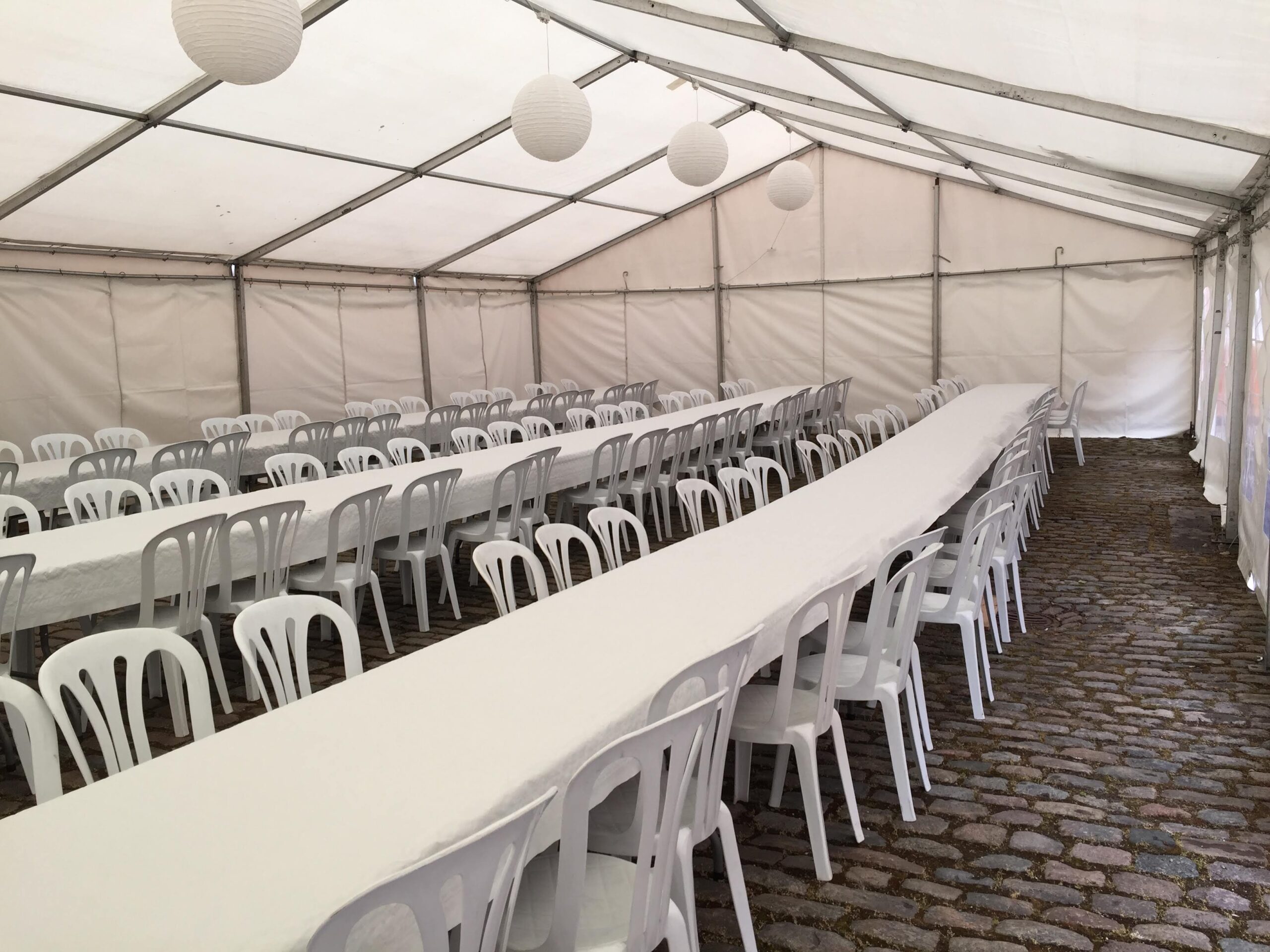Hvide telte føres i 6, 9 eller 12 meters bredde, og længden udvides med 3 meter ad gangen.